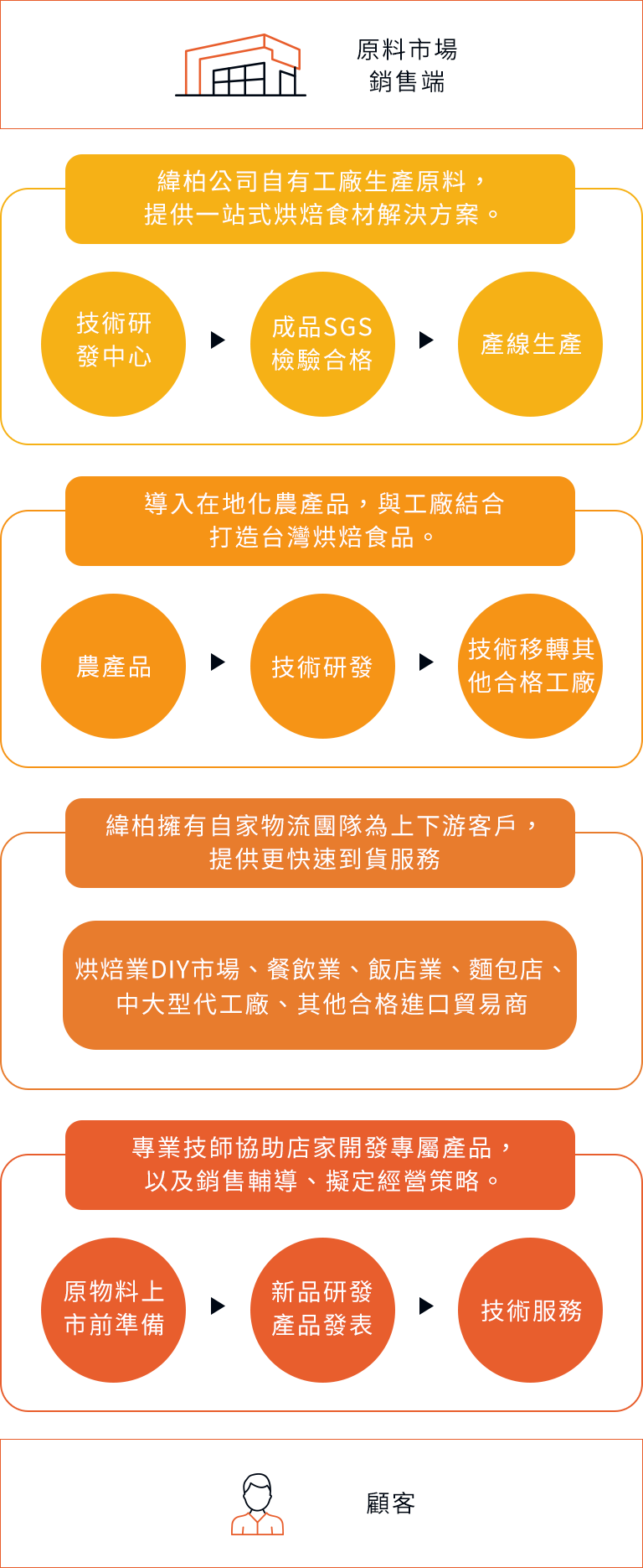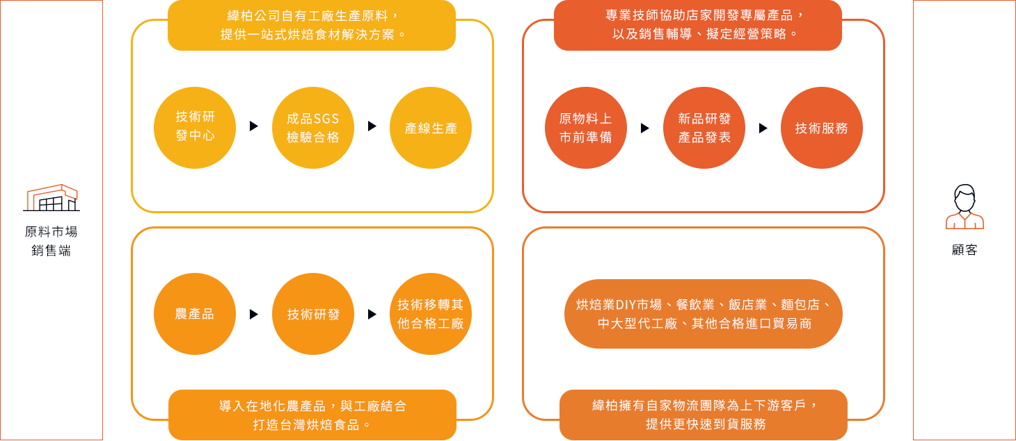 烘焙業除了嚴格精選物料食材來服務客戶之外,必需在銷售服務層面上提升,所以緯柏公司成立了技術服務部門及行銷服務團隊,於客戶服務全面升級之銷售服務。